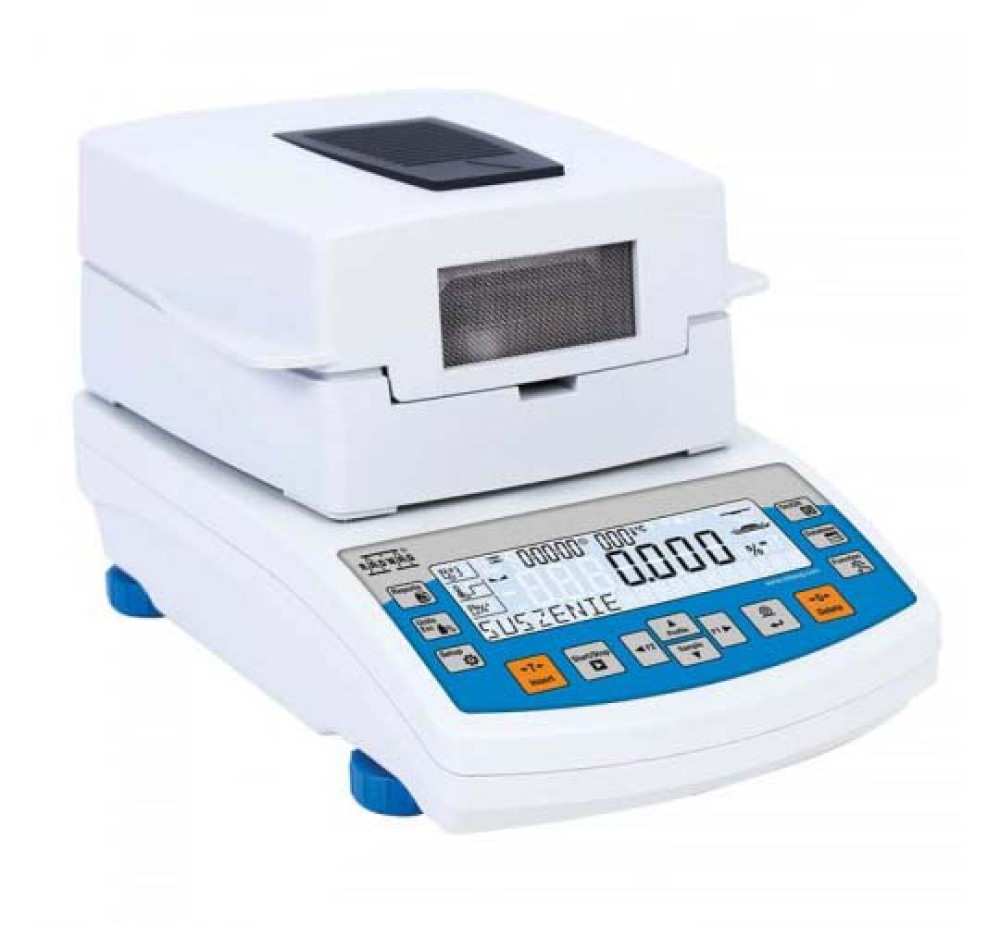Máy phân tích độ ẩm, sử dụng các biểu tượng tương ứng, báo hiệu chế độ đang được kích hoạt, kết nối máy tính và các chức năng, cả cân và dịch vụ.